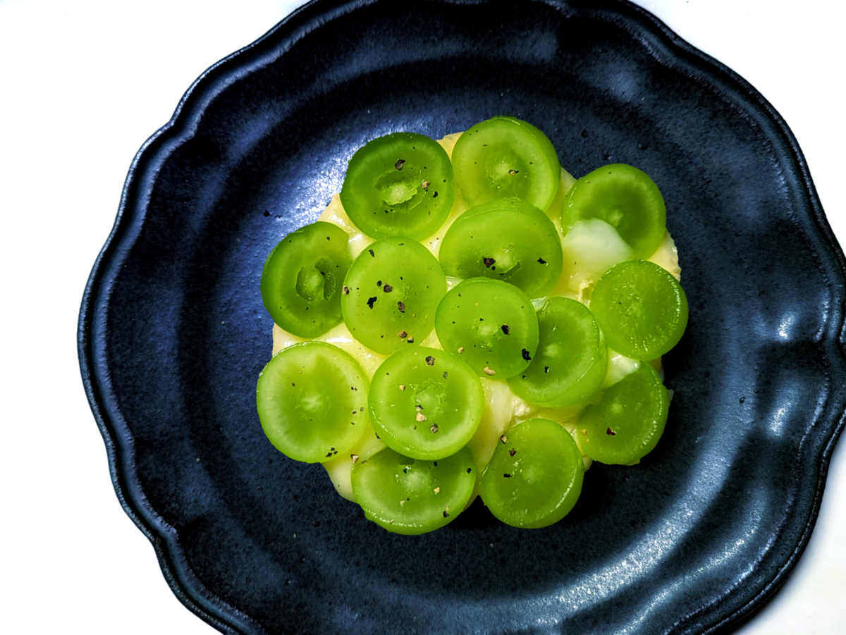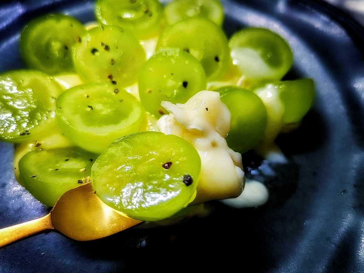 これまでにシャインマスカット×チーズはいろいろ試してきたけれど、焼いたカマンベールとのマッチングは初めて。ジューシーなシャインマスカットと、焼いてミルキーさが増したカマンベール、ぴったりでした。