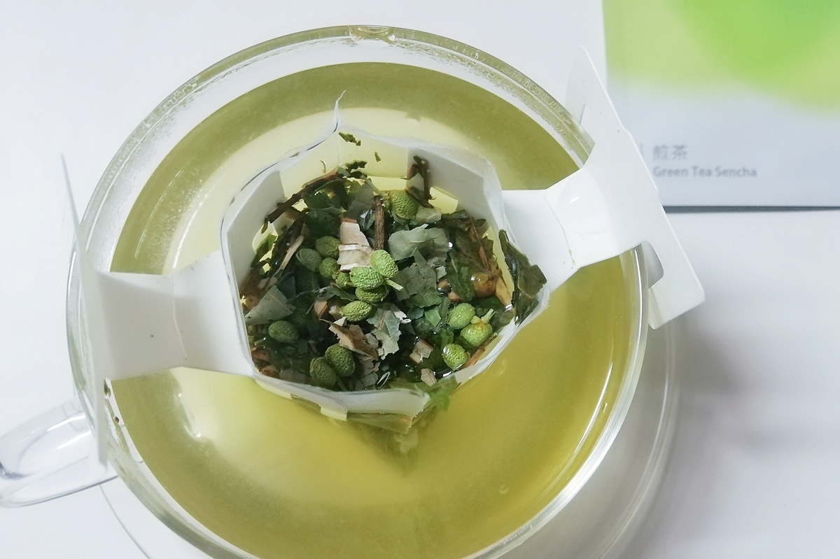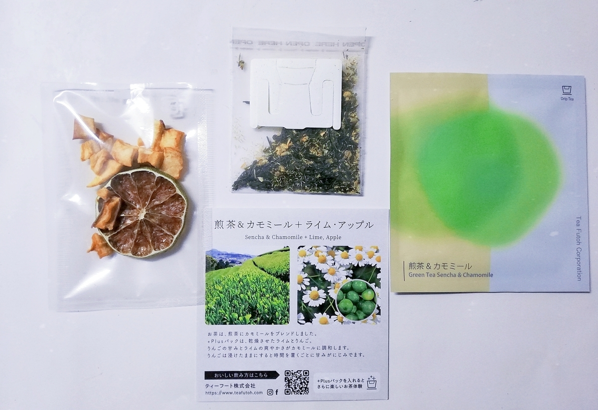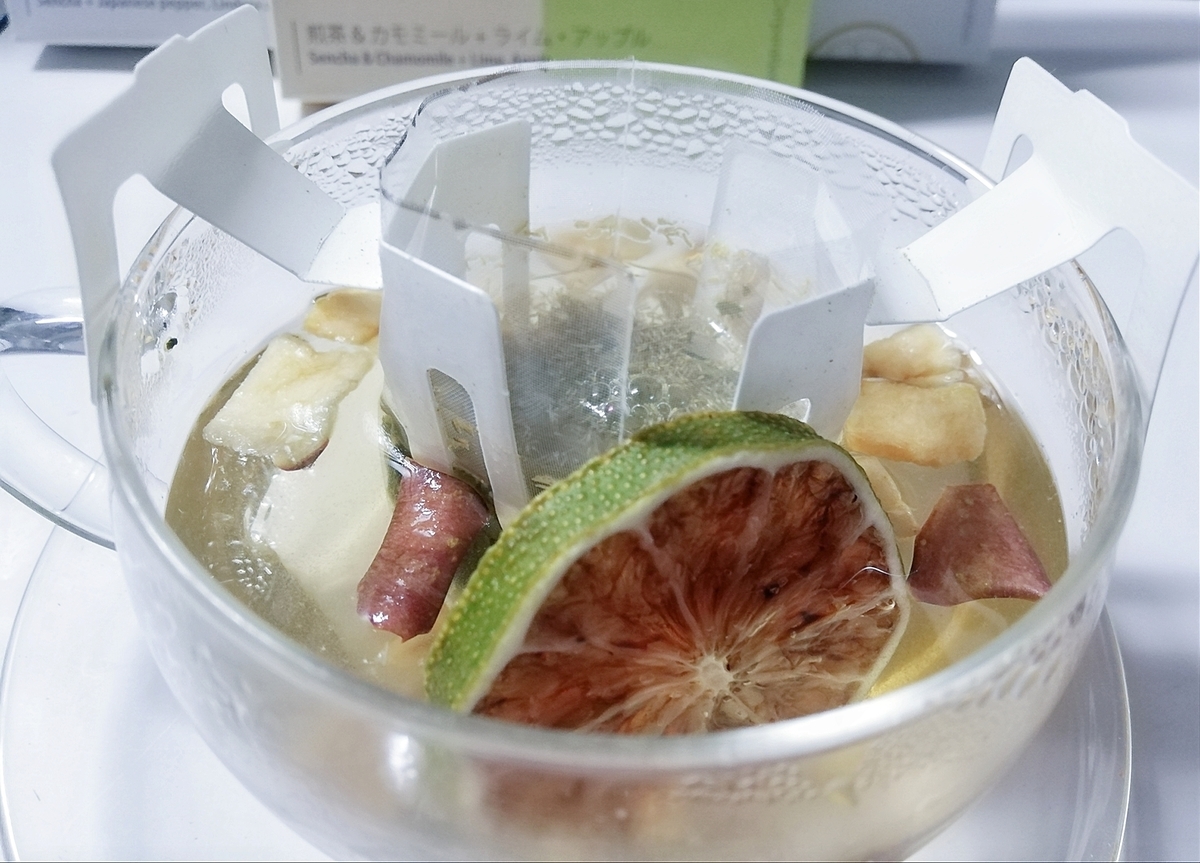 例えばこれは、煎茶とカモミールのブレンドティーにライムとアップルをプラスしたもの。