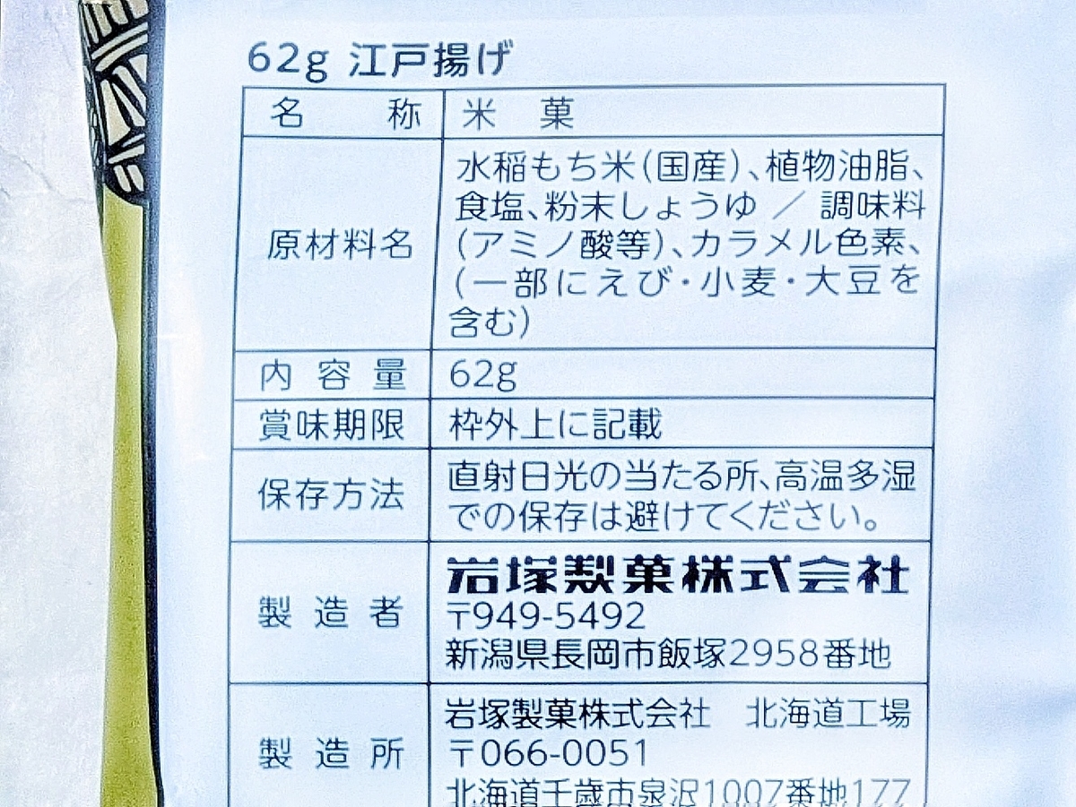 作っているのは全国的に有名な岩塚製菓。ここのお煎餅には日常的にお世話になってる。でも、江戸揚げは初めて見ました。