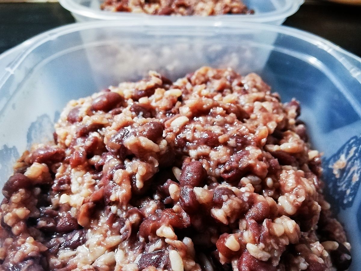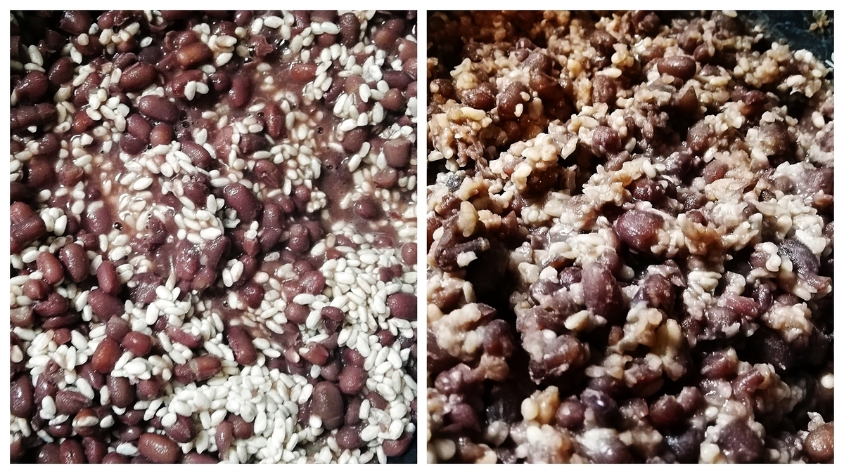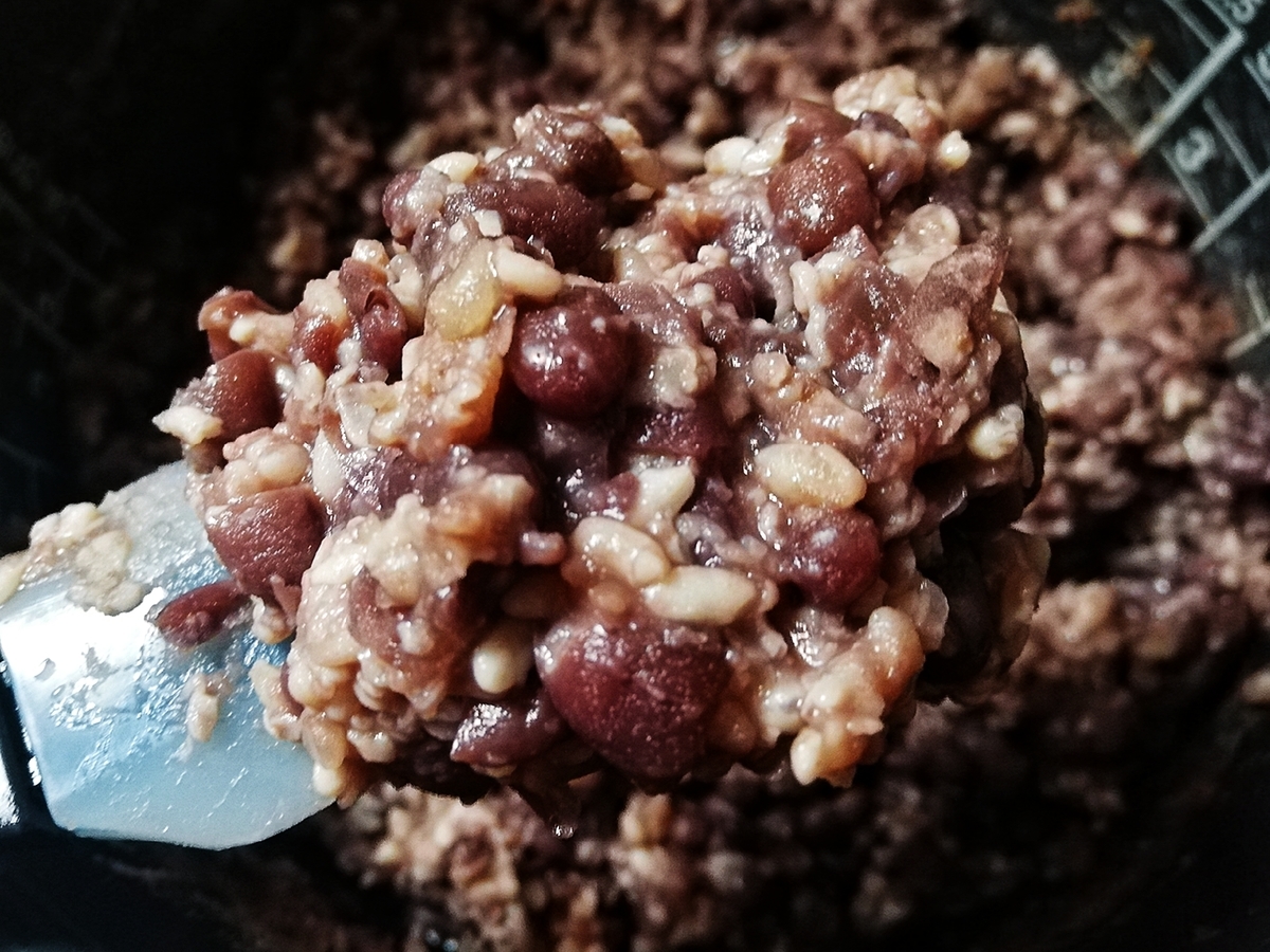 炊き上がった小豆を60度以下にまで冷ましたら、米麹と水と混ぜて炊飯器の保温で6時間から8時間放置。途中2時間おきにかき混ぜます。写真右が8時間後の様子。