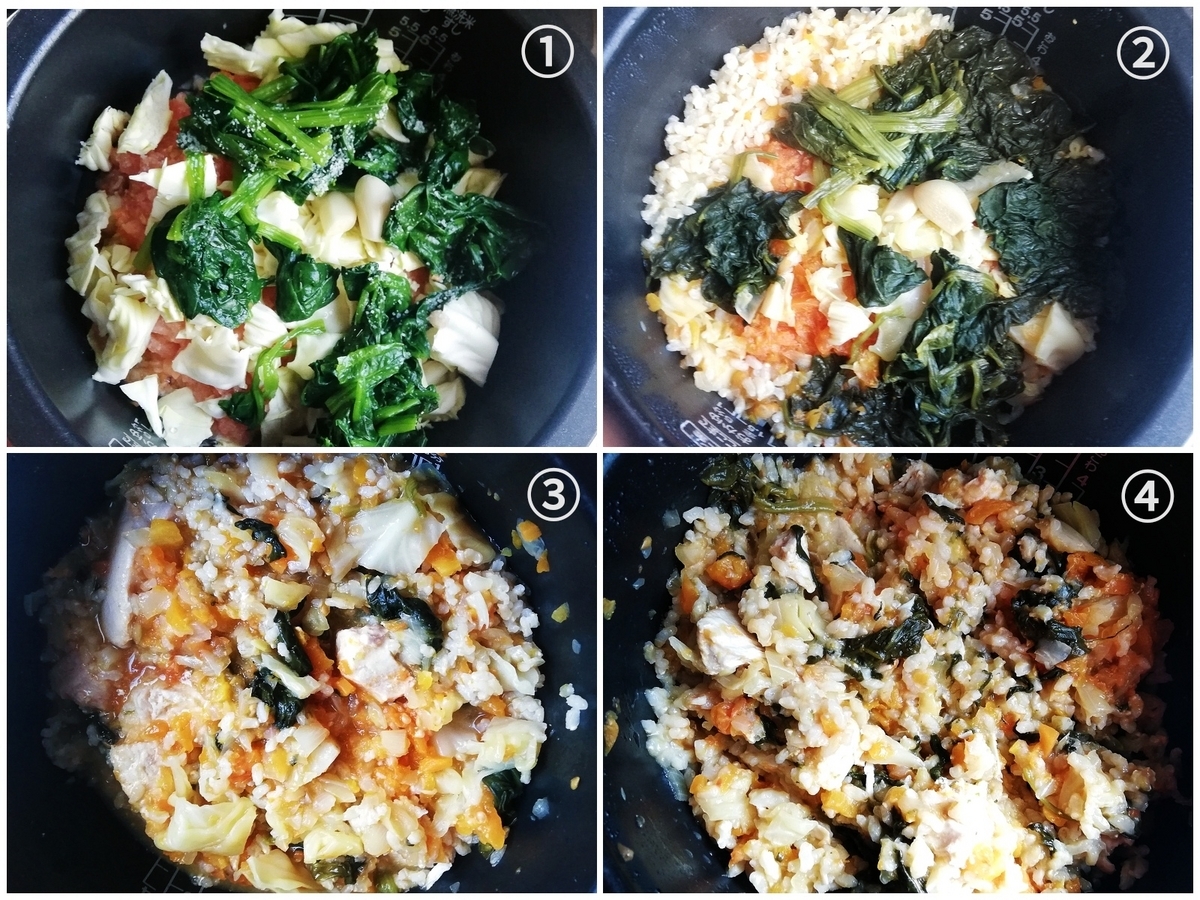玄米と水→カットしたむね肉→ローリエ→パイセンでじゃんじゃん刻んだ野菜→にんにく→塩の順でセット完了。