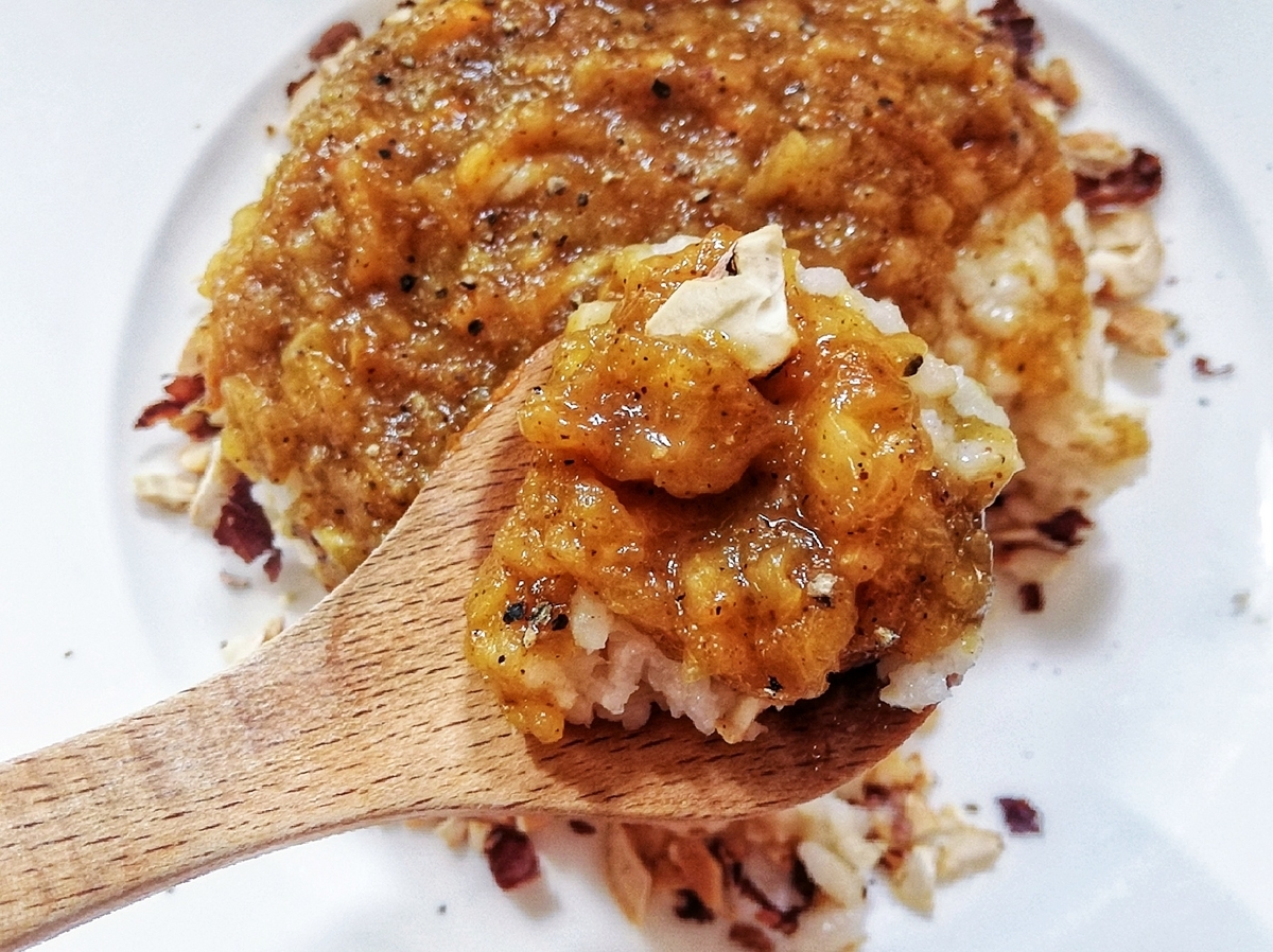 発芽玄米ご飯の上に柿カレーをのせて、刻んだカシューナッツを添えたら出来上がり。