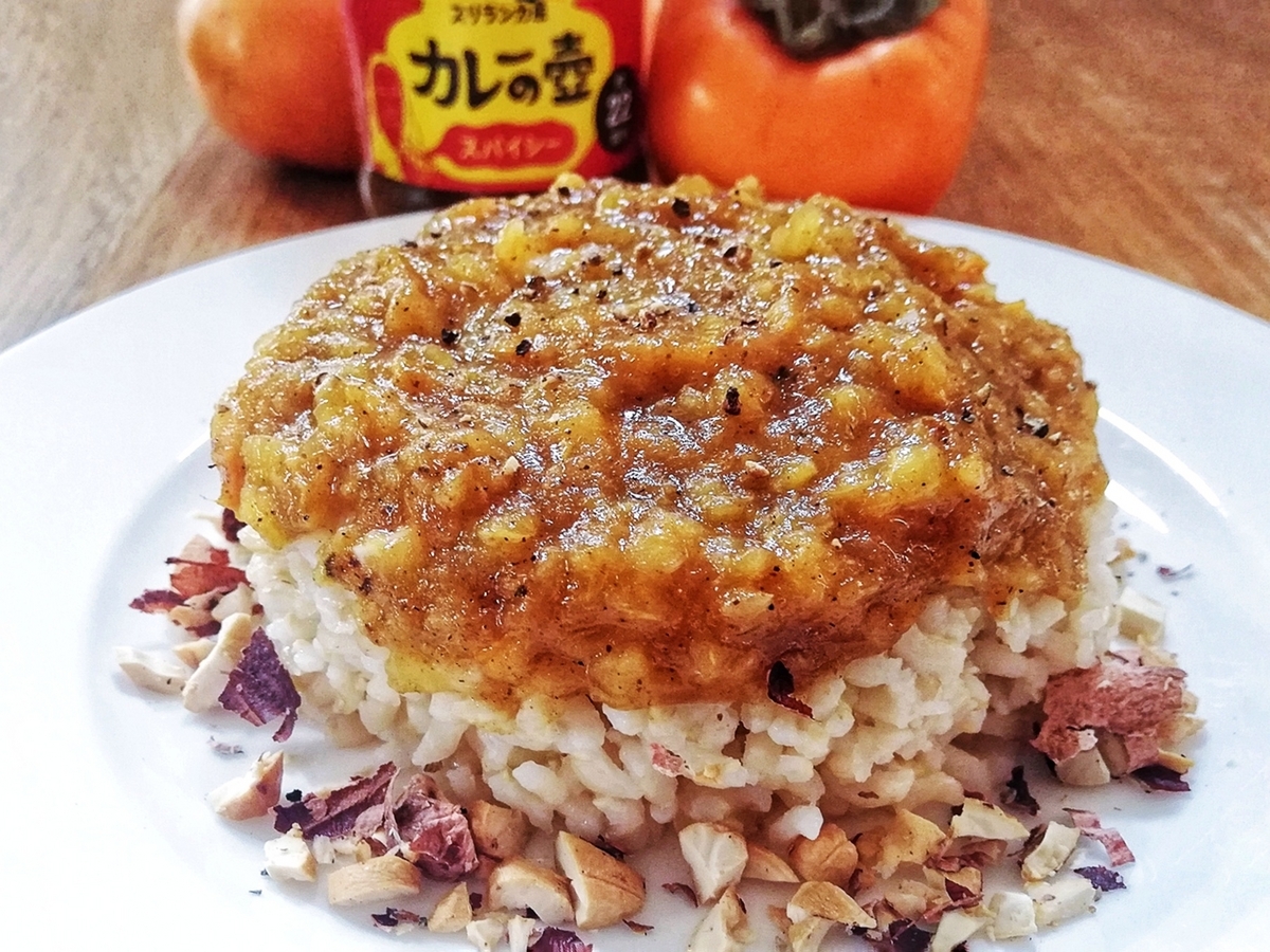 柿をFPで刻み、ココナッツオイルを熱したフライパンでみじん切りにしたにんにくを炒める。そこに柿を投入して熱が入ったら、カレーの壺を入れてさらに炒める。塩胡椒を軽くふったら出来上がり。