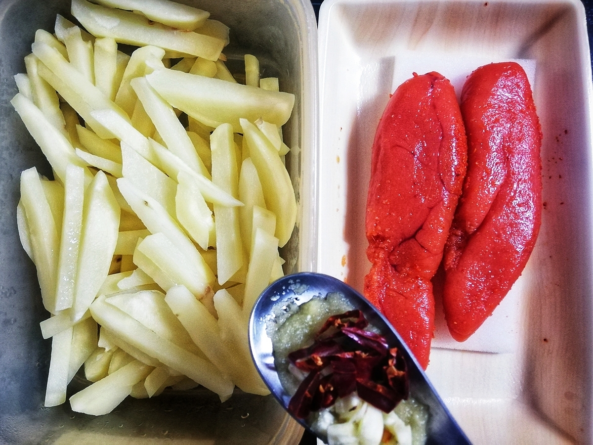 オリーブオイルにすりおろしたにんにくとみじん切りにんにく、唐辛子を入れて香りがたつまで加熱。あらかじめレンジで加熱しておいた千切りじゃがいもを加えてオイルを纏わせたら、明太子をのせて数分。