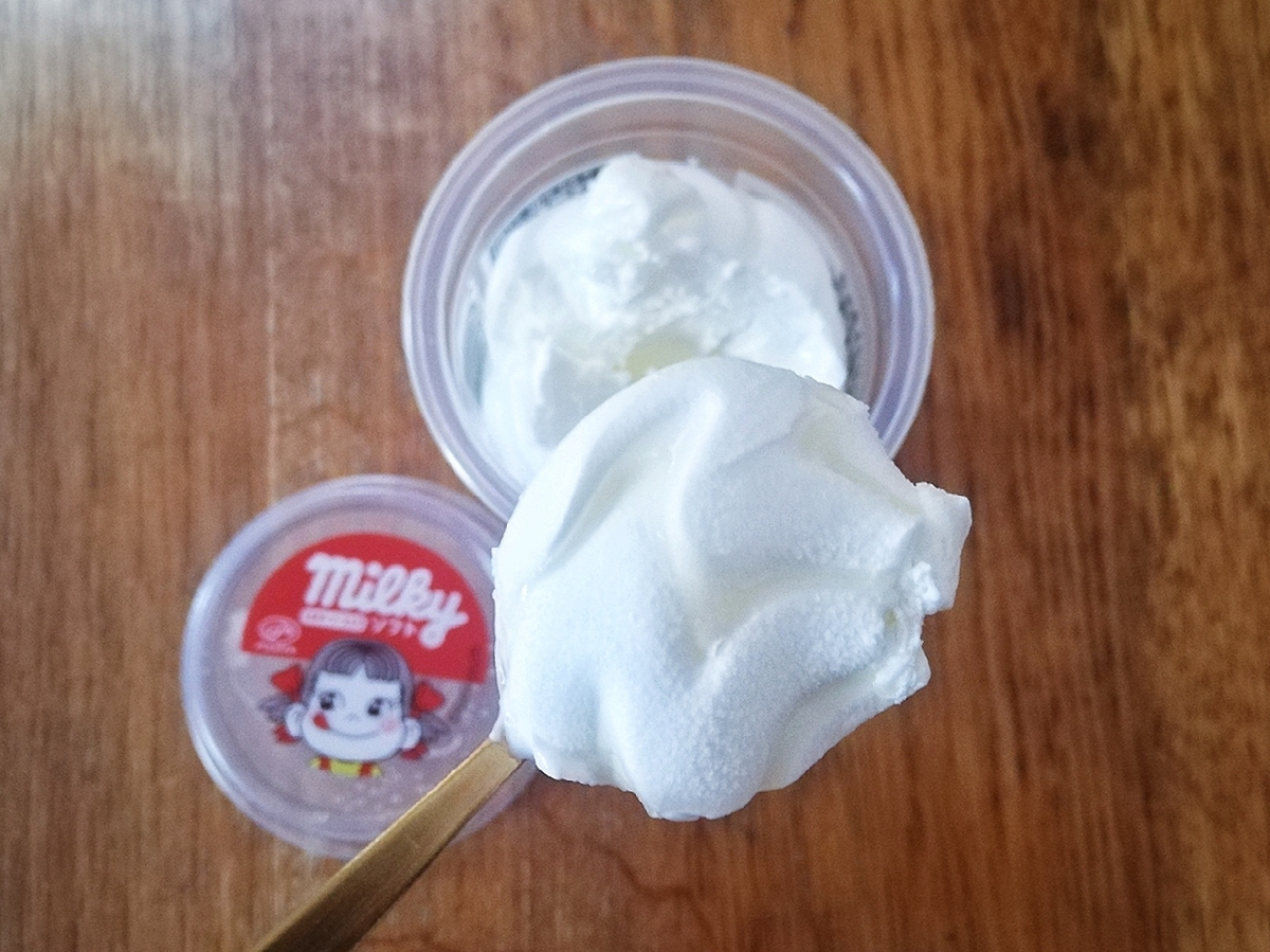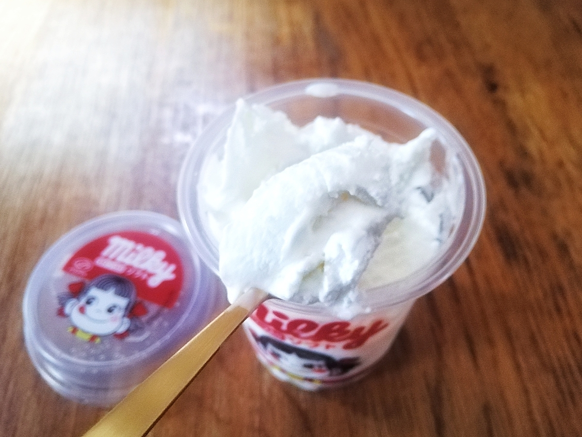 少し待って柔らかくしてグルグルしたら、ソフトクリームが一気にグレードアップします。練乳がかかったふわふわホイップクリームアイス、みたいな感覚。
