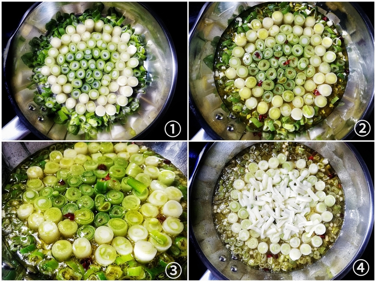 ② みじん切りにしたにんにくと輪切りにした唐辛子を加えて、オリーブオイルをネギが浸るくらいに入れる。