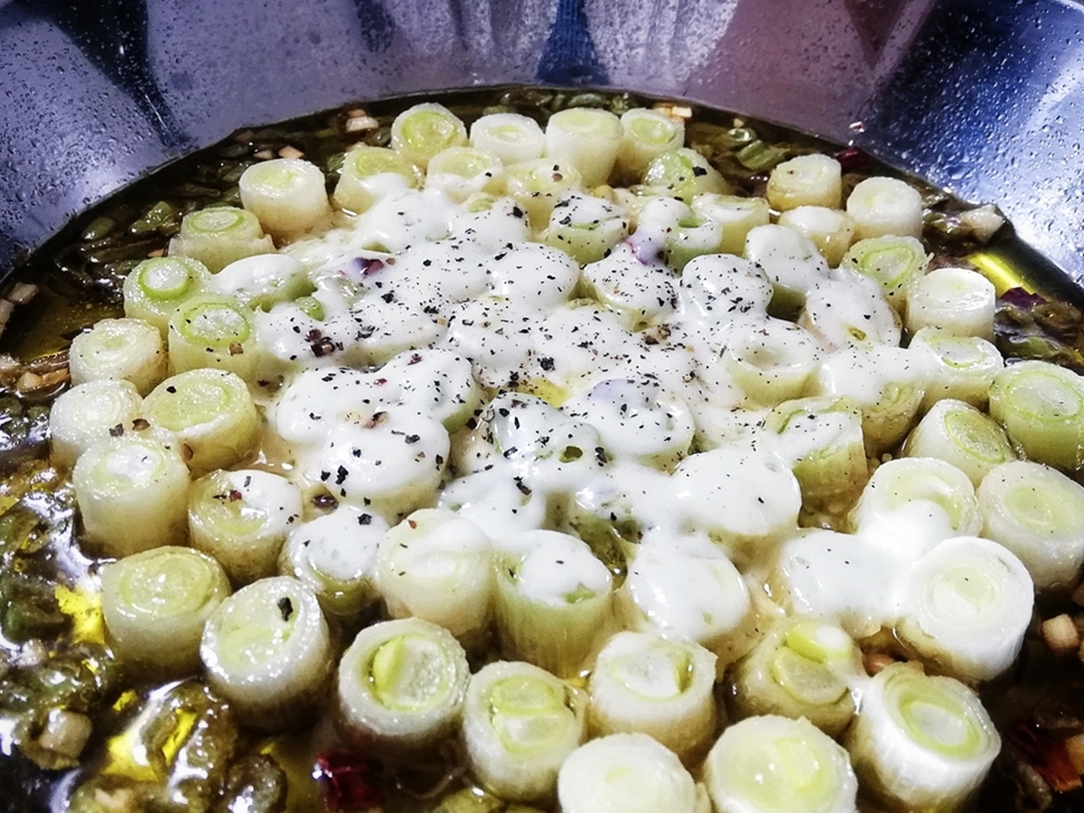 ブラックペッパーをかけて熱々のうちにいただきます。ネギはもちろん、ネギオイルがめちゃくちゃ美味しい。バケットにつけたり、パスタにしたり、と残ったオイルも全部使える。