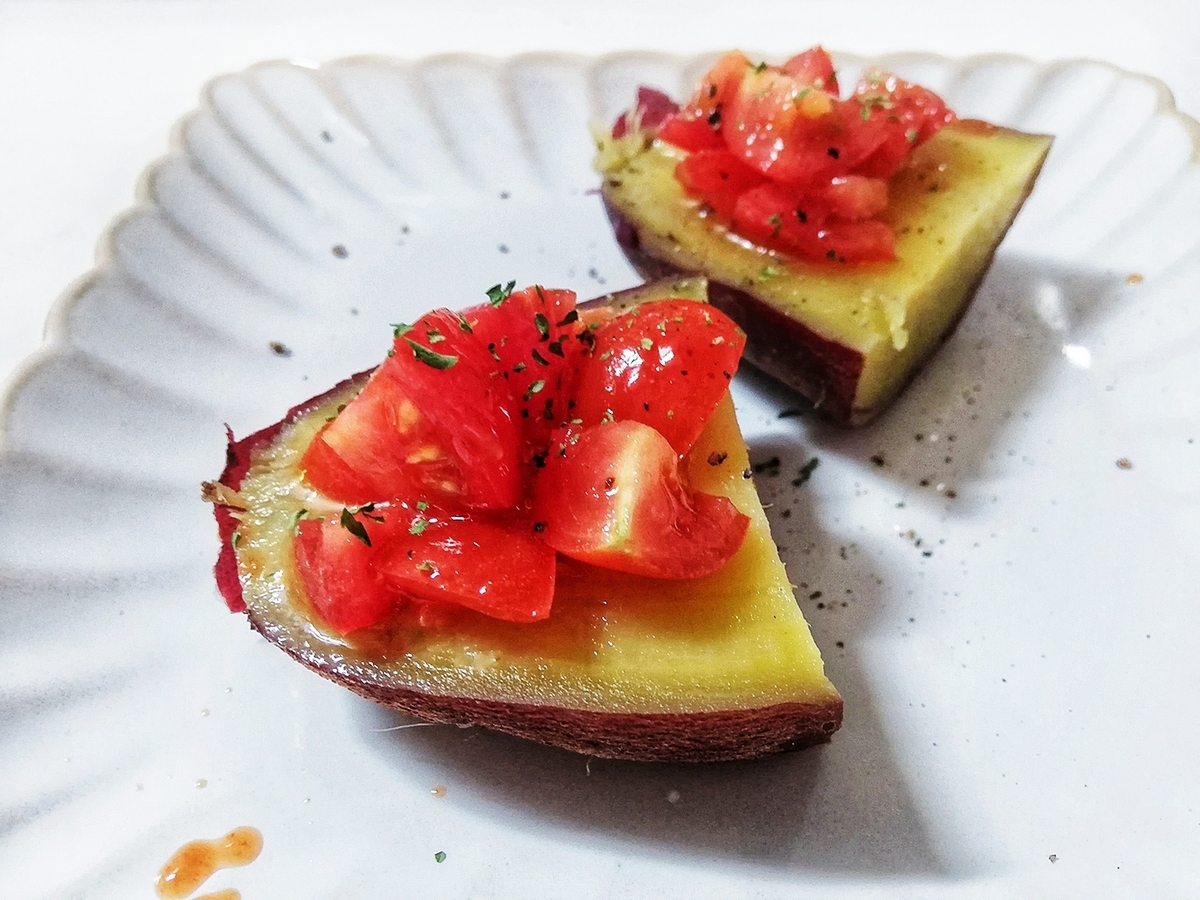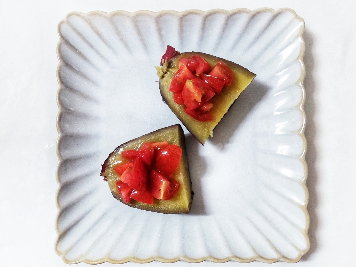 さつまいもにタバスコマリネトマトをたっぷりのせて。