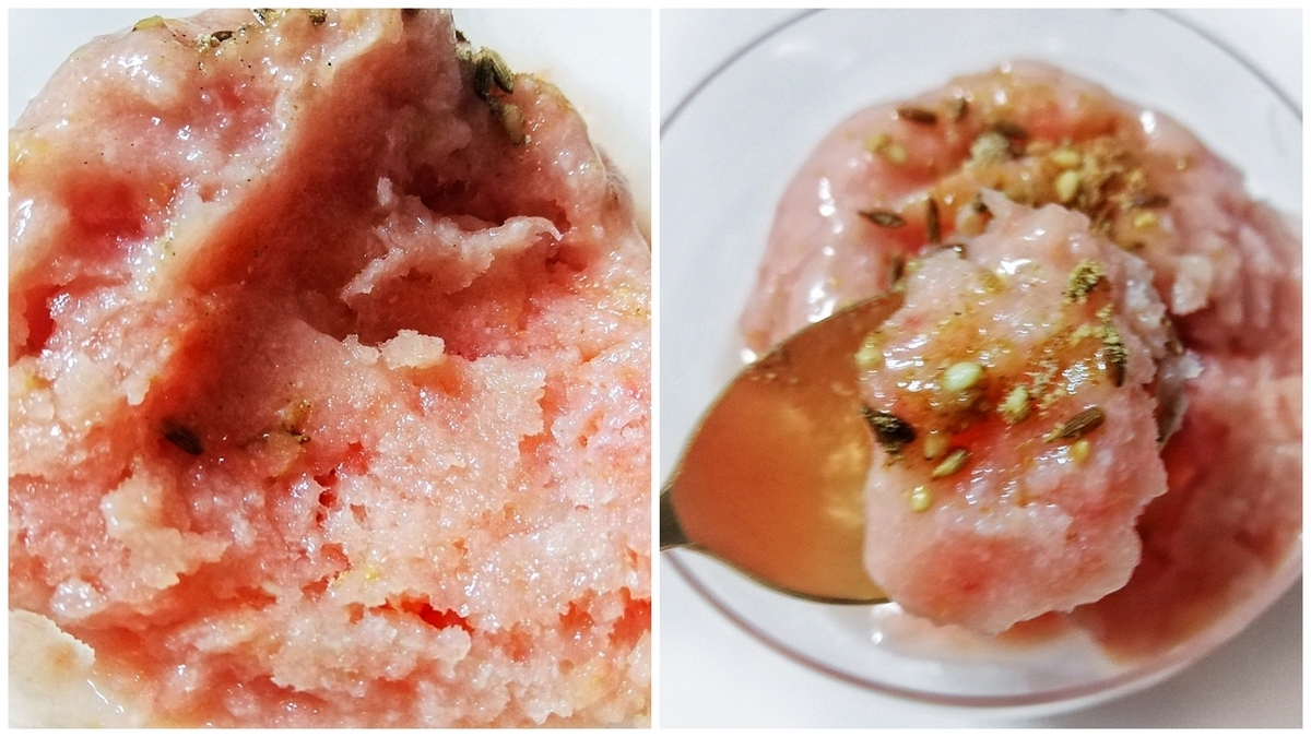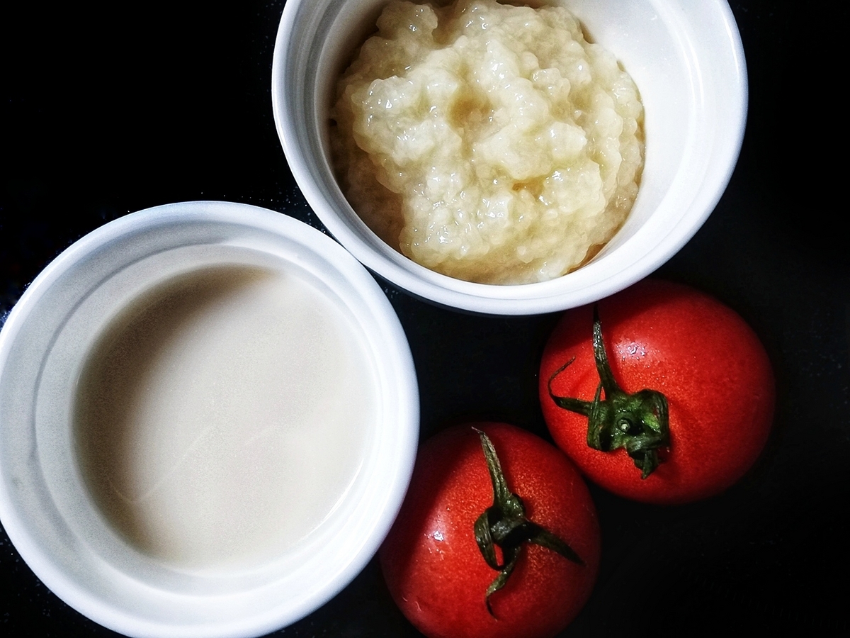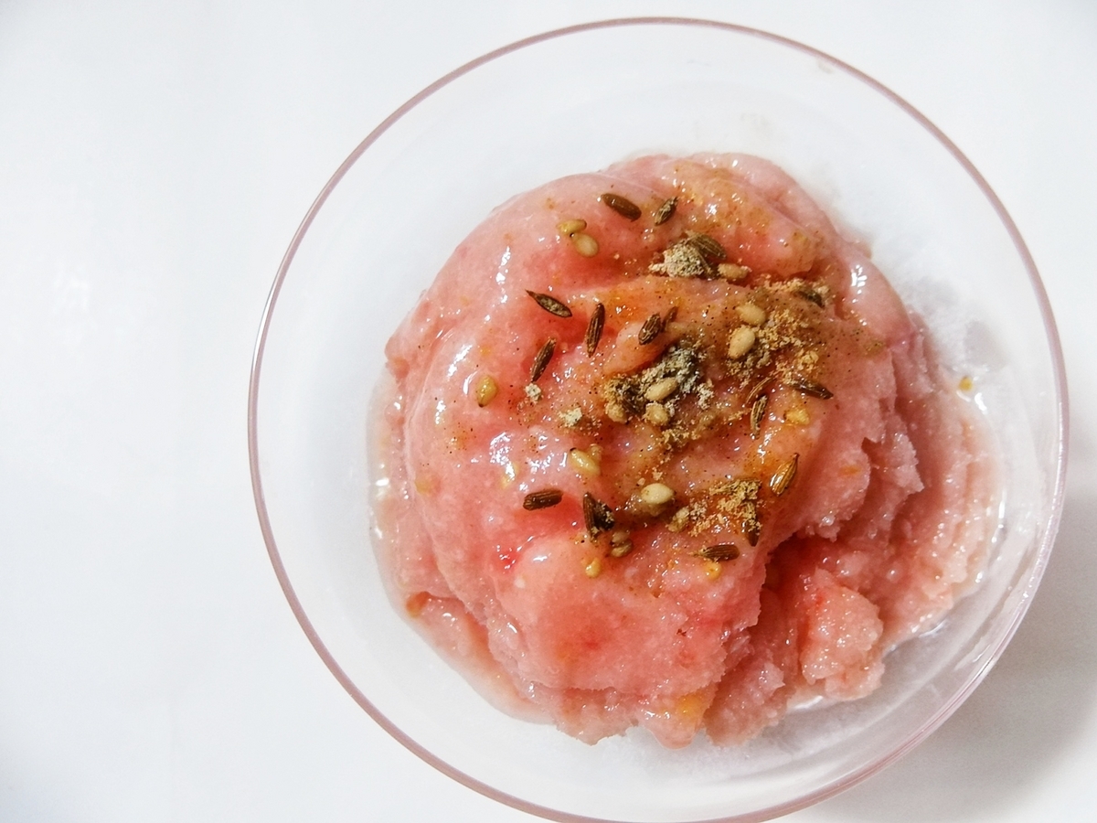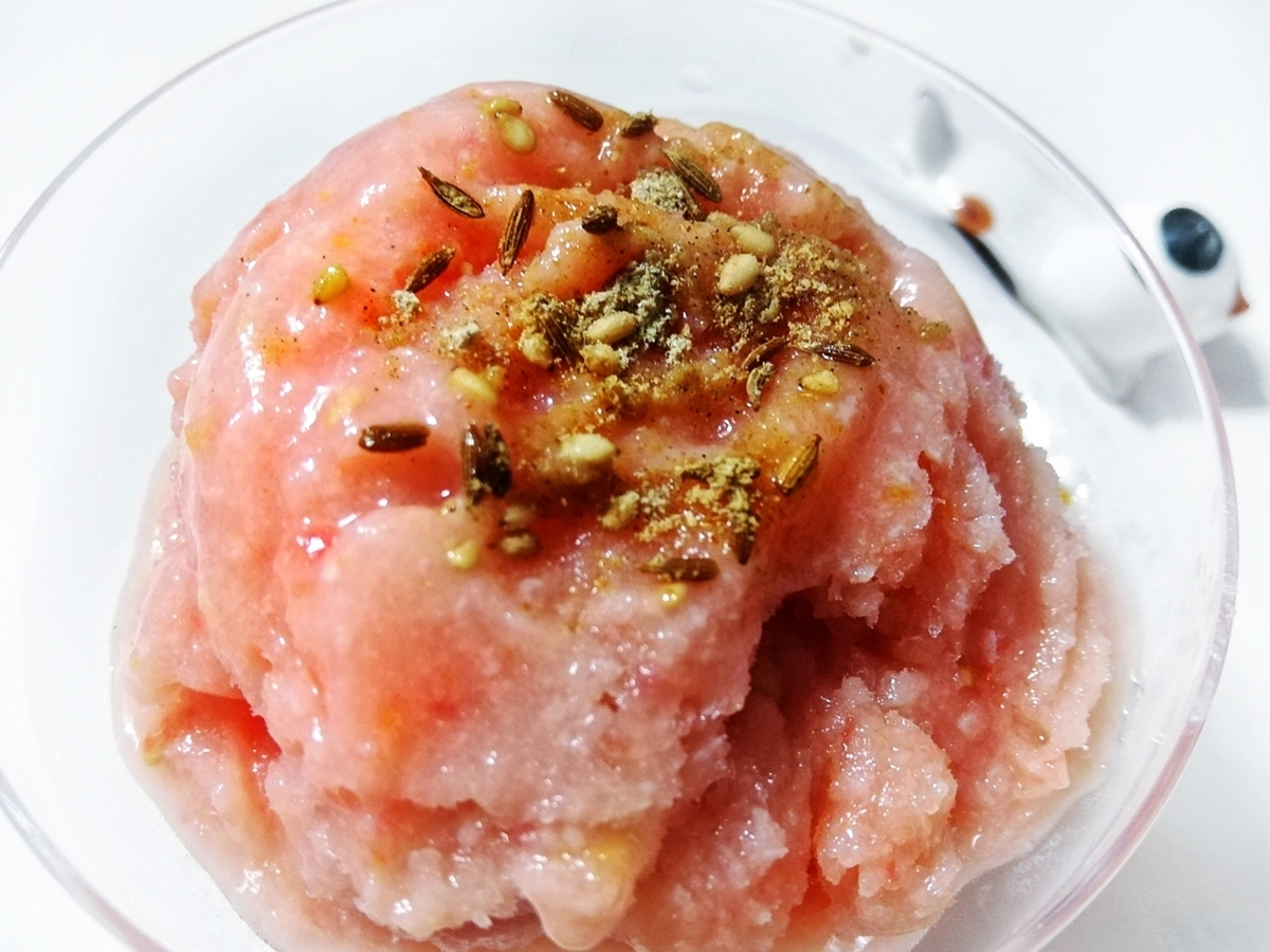消化促進効果のあるいつものスパイスに、今回はナツメグをプラス。体を冷やすトマトを更に冷たくしてお腹に入れるので、体を暖める効果のあるナツメグを使いました。