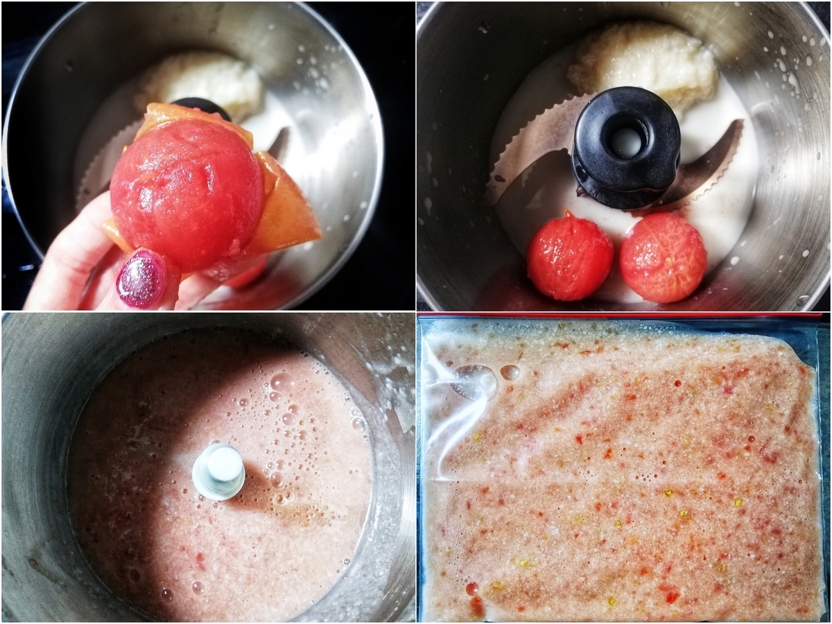 トマトを湯剥きして後は混ぜるだけ。ジップロックにいれて2時間ほど冷凍庫に。