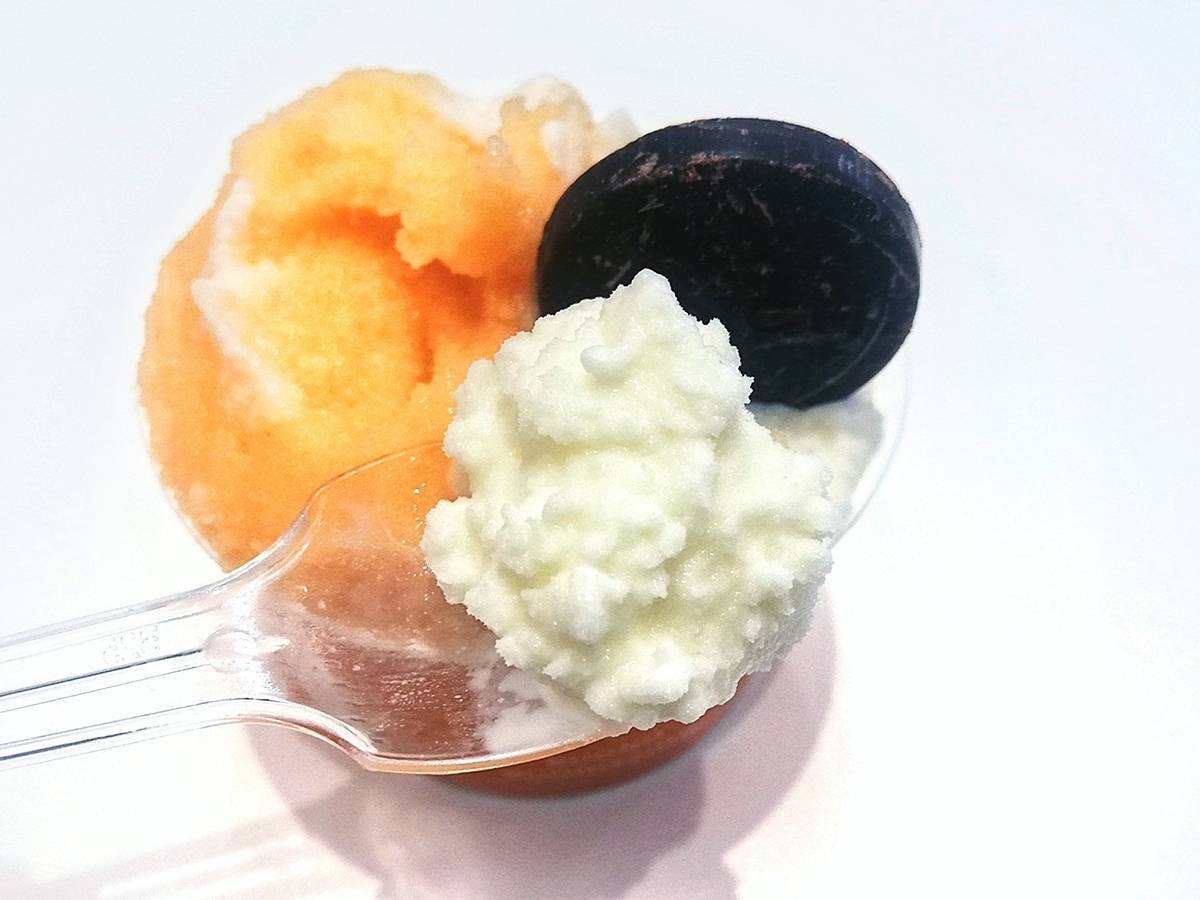 オリーブオイルを選ぼうと思っていたけれど、試食させてくれたし、パルジャミーノ・レッジャーノとベースのミルクが同じだと教えてもらったので、メロンにしました。